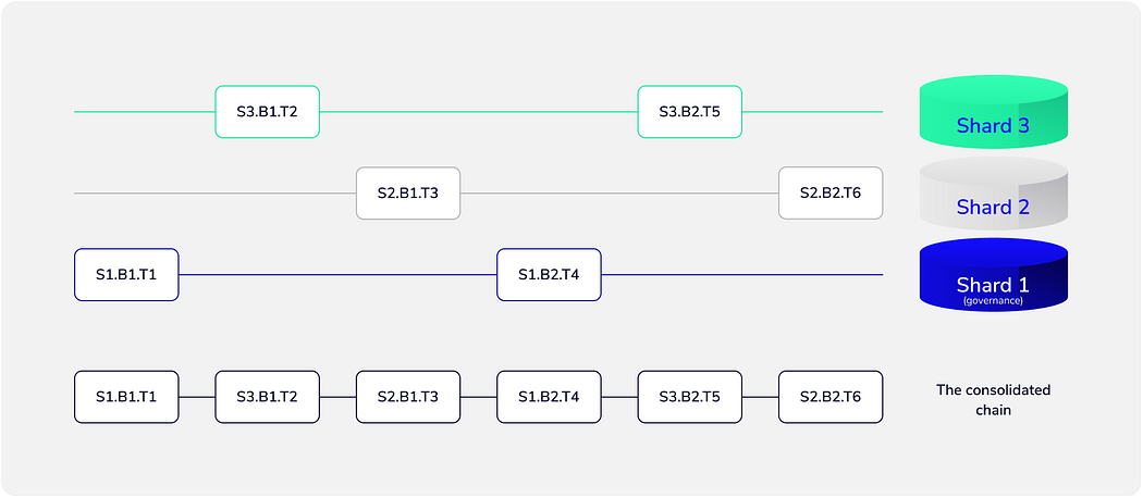An illustration of the scalable block creation where each shard creates verifiable blocks according to the consensus model presented in the Poseidon blog is provided below. The consolidated blockchain shows how the sharding scales linearly in the number of shards i.e. a blockchain running with three shards can handle three times as many concurrent transactions as a blockchain running without sharding. To see this, note that the consensus process, including the time consuming propagation of messages, is done in parallel and independently across shards. A governance shard keeps track of the shards and distributes the block creation work across the independent shards. Also, the security model ensures that all new nodes are properly represented across all shards and thereby validate every transaction.