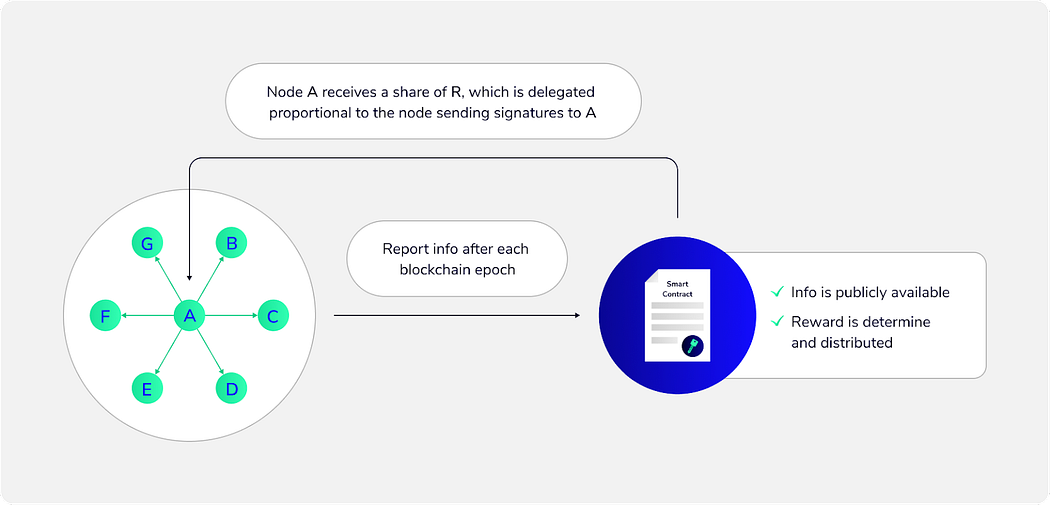 The first part of the market for trust is to incentivize good performance by the individual nodes running basic blockchain services. This covers P2P propagation of information, validation and execution of transactions. The initial incentive provision will adjust the simple proportional reward sharing with direct observable measures such as the number of blocks produced as Sequencer. This rewards the best nodes performing the very basic operation as Sequencer. This basic incentive provision will be extended with an advanced incentive scheme that rewards nodes for revealing the otherwise hidden activities in the P2P network. The collected information is made public and used to reward the nodes that are the most active propagators of information in the P2P network. The intuition for this model is illustrated below.